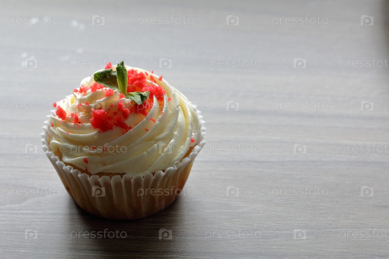 Красный бархатный кекс. Готовые лепешки лежат на столе. Украшен листьями мяты