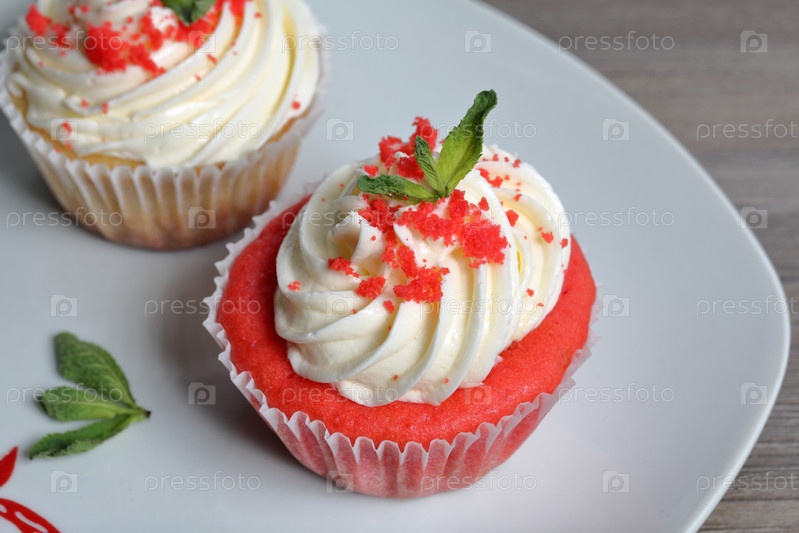 Красный бархатный кекс. Готовые лепешки лежат на тарелке. Украшен листьями мяты