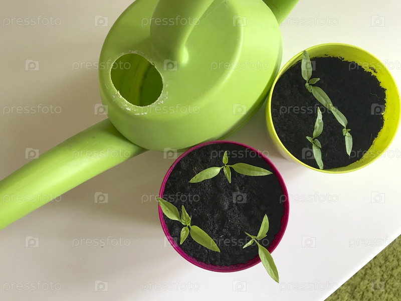 На столе стоит рассада после пересадки в горшки. Рядом стоит лейка. Пересадка рассады острого перца