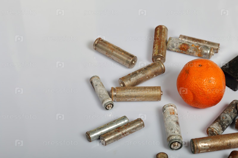 Отработанные батарейки и увядший мандарин. Утилизация отработанных аккумуляторов. Защита окружающей среды. День Земли
