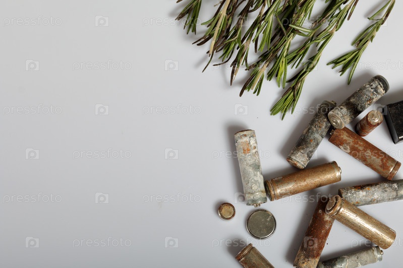 Использованные батарейки и ветка зелени. Утилизация отработанных аккумуляторов. Защита окружающей среды. День Земли