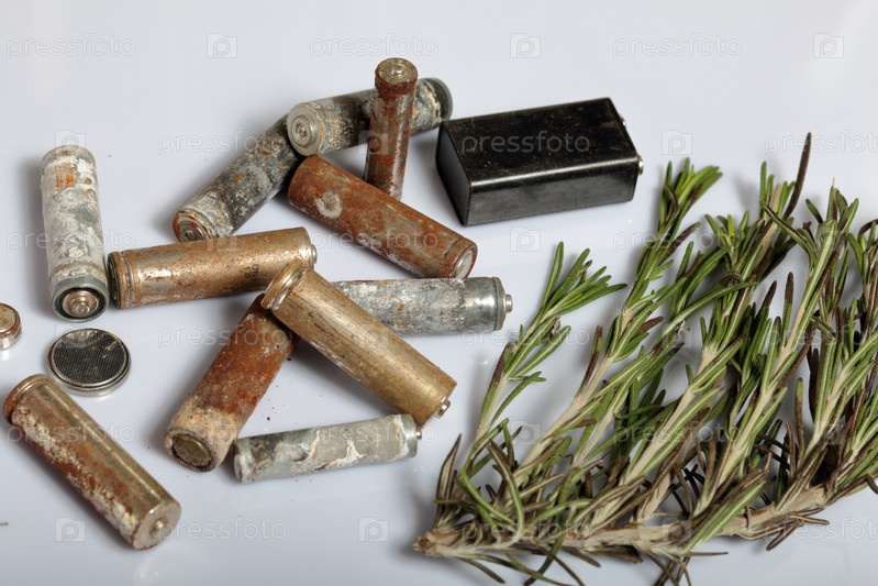 Использованные батарейки и ветка зелени. Утилизация отработанных аккумуляторов. Защита окружающей среды. День Земли