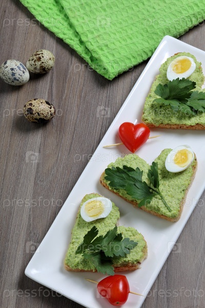 Сэндвичи на завтрак. Ломтики хлеба в форме сердечек, намазанные молотым авокадо. Украшается вареными перепелиными яйцами, петрушкой и помидорами. Развернутый на белой прямоугольной тарелке