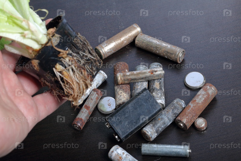 Отработанные батарейки и зеленый салат, растущий в горшке. Утилизация отработанных аккумуляторов. Защита окружающей среды. День Земли
