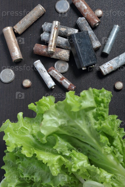 Отработанные батарейки и зеленый салат, растущий в горшке. Утилизация отработанных аккумуляторов. Защита окружающей среды. День Земли