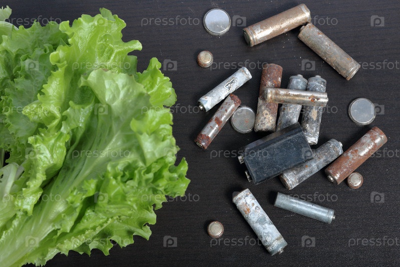 Отработанные батарейки и зеленый салат, растущий в горшке. Утилизация отработанных аккумуляторов. Защита окружающей среды. День Земли