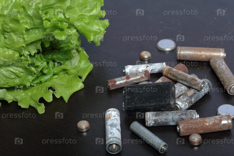 Отработанные батарейки и зеленый салат, растущий в горшке. Утилизация отработанных аккумуляторов. Защита окружающей среды. День Земли