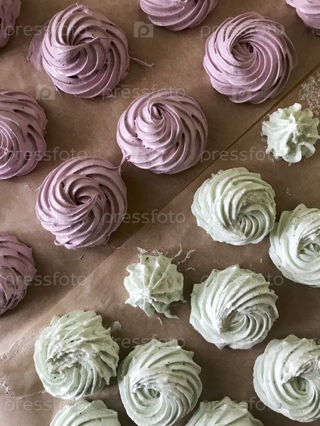 Домашний зефир Разного цвета. Лежит на пищевой бумаге, чтобы высохнуть