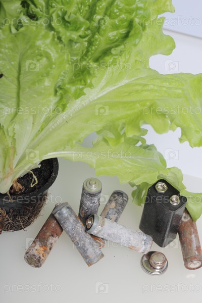 Отработанные батарейки и зеленый салат, растущий в горшке. Утилизация отработанных аккумуляторов. Защита окружающей среды. День Земли