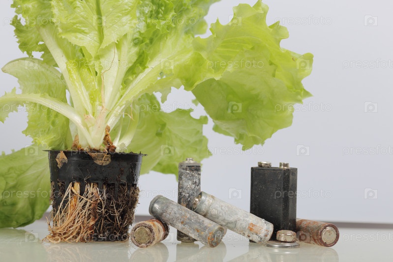 Отработанные батарейки и зеленый салат, растущий в горшке. Утилизация отработанных аккумуляторов. Защита окружающей среды. День Земли
