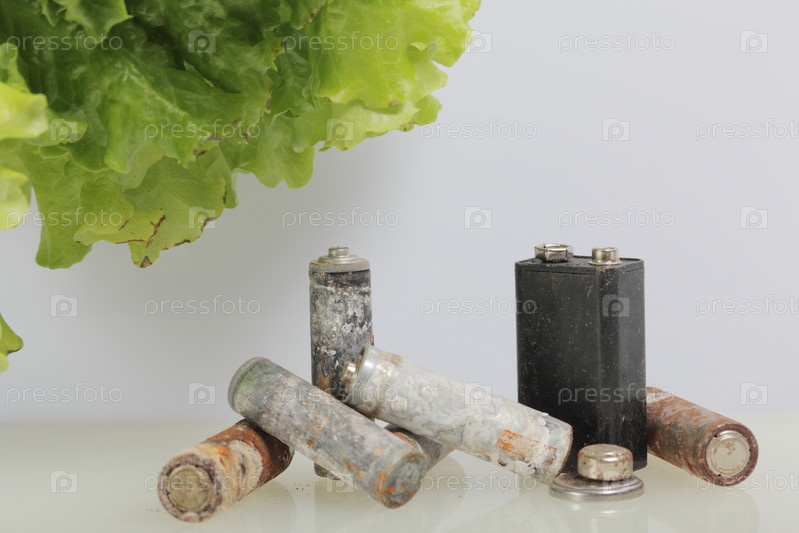 Отработанные батарейки и зеленый салат, растущий в горшке. Утилизация отработанных аккумуляторов. Защита окружающей среды. День Земли