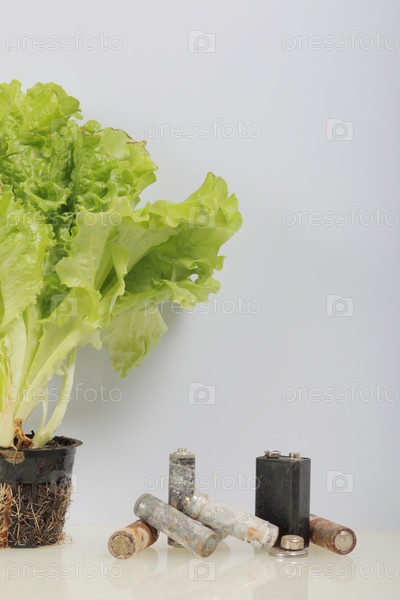 Отработанные батарейки и зеленый салат, растущий в горшке. Утилизация отработанных аккумуляторов. Защита окружающей среды. День Земли