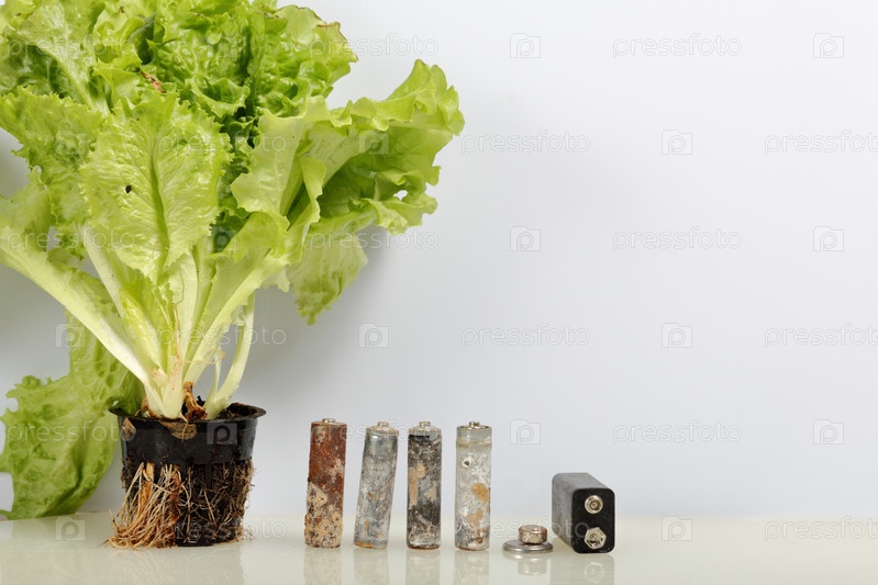Отработанные батарейки и зеленый салат, растущий в горшке. Утилизация отработанных аккумуляторов. Защита окружающей среды. День Земли