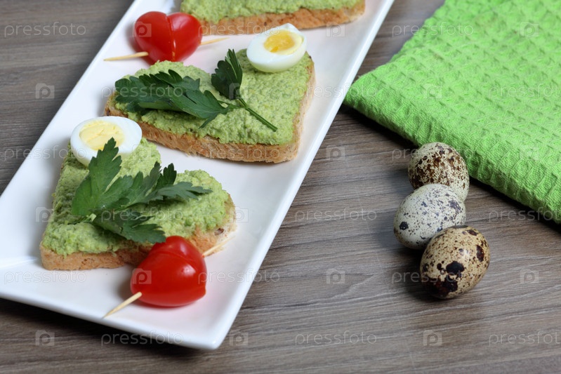 Сэндвичи на завтрак. Ломтики хлеба в форме сердечек, намазанные молотым авокадо. Украшается вареными перепелиными яйцами, петрушкой и помидорами. Развернутый на белой прямоугольной тарелке