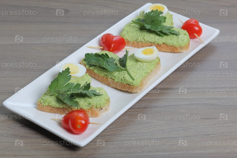Сэндвичи на завтрак. Ломтики хлеба в форме сердечек, намазанные молотым авокадо. Украшается вареными перепелиными яйцами, петрушкой и помидорами. Развернутый на белой прямоугольной тарелке