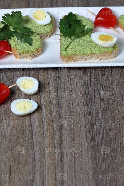 Сэндвичи на завтрак. Ломтики хлеба в форме сердечек, намазанные молотым авокадо. Украшается вареными перепелиными яйцами, петрушкой и помидорами. Развернутый на белой прямоугольной тарелке
