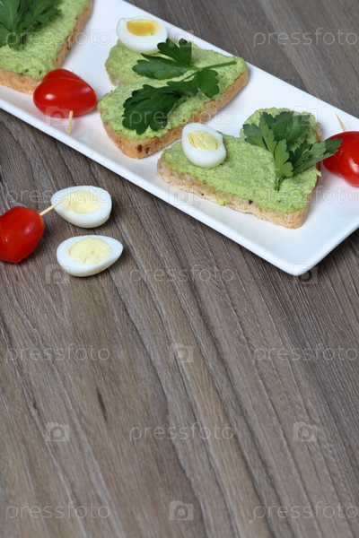 Сэндвичи на завтрак. Ломтики хлеба в форме сердечек, намазанные молотым авокадо. Украшается вареными перепелиными яйцами, петрушкой и помидорами. Развернутый на белой прямоугольной тарелке