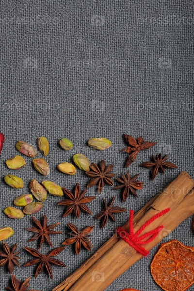 Сушеные мандарины нарезаем кусочками для украшения десерта. Рядом лежат фисташки, анис и палочки корицы, перевязанные красной нитью. На сером фоне
