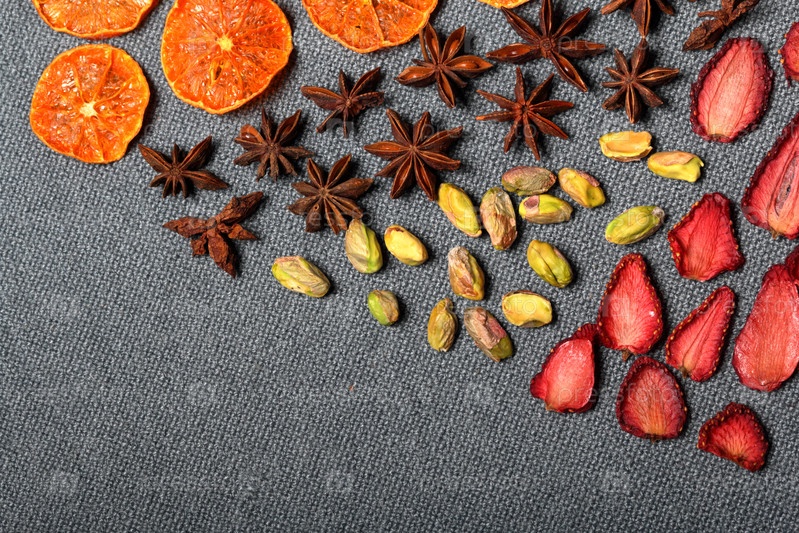 Сушеные мандарины и клубнику нарезаем кусочками для украшения десерта. Рядом фисташки и анис. На сером фоне