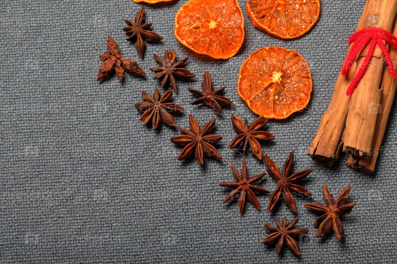 Сушеные мандарины, нарезанные кусочками, для украшения десерта. Рядом лежат палочки аниса и корицы, перевязанные красной нитью. На сером фоне