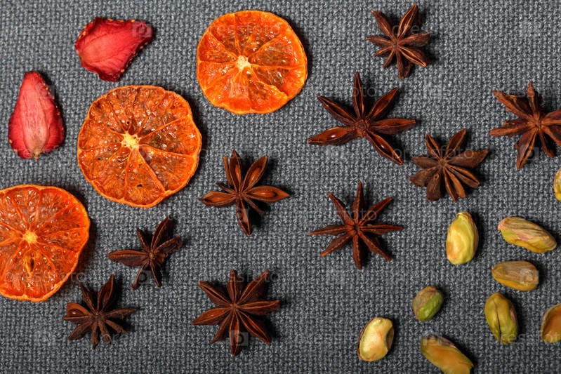 Сушеные мандарины и клубнику нарезаем кусочками для украшения десерта. Рядом фисташки и анис. На сером фоне
