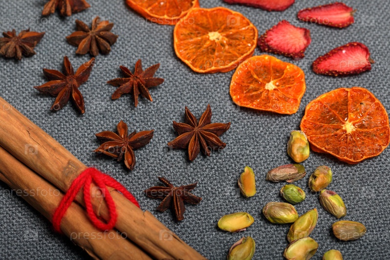 Сушеные мандарины и клубнику нарезаем кусочками для украшения десерта. Рядом лежат фисташки, анис и палочки корицы, перевязанные красной нитью. На сером фоне