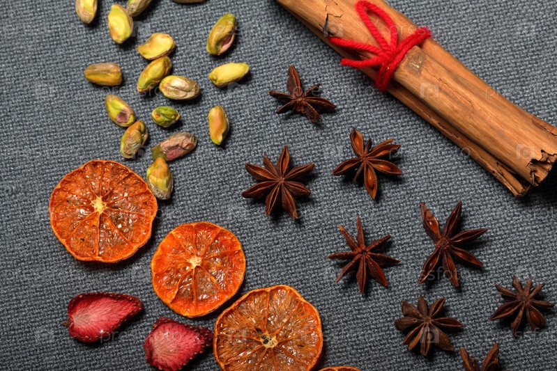 Сушеные мандарины и клубнику нарезаем кусочками для украшения десерта. Рядом лежат фисташки, анис и палочки корицы, перевязанные красной нитью. На сером фоне