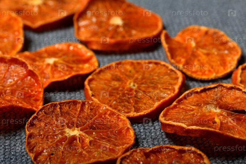 Мандарины нарезают дольками и сушат для украшения десертов. На сером фоне