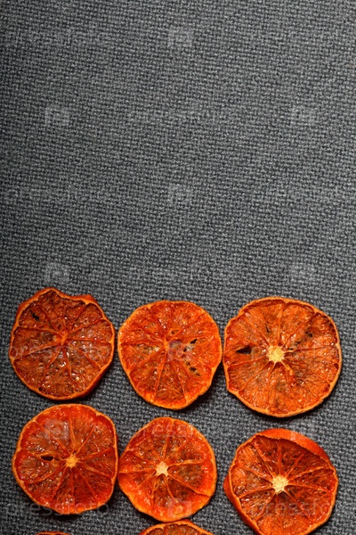 Мандарины нарезают дольками и сушат для украшения десертов. На сером фоне