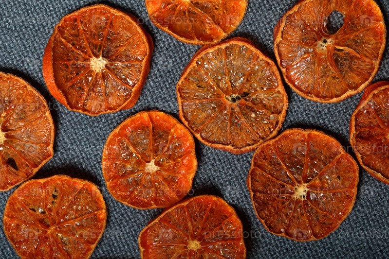 Мандарины нарезают дольками и сушат для украшения десертов. На сером фоне