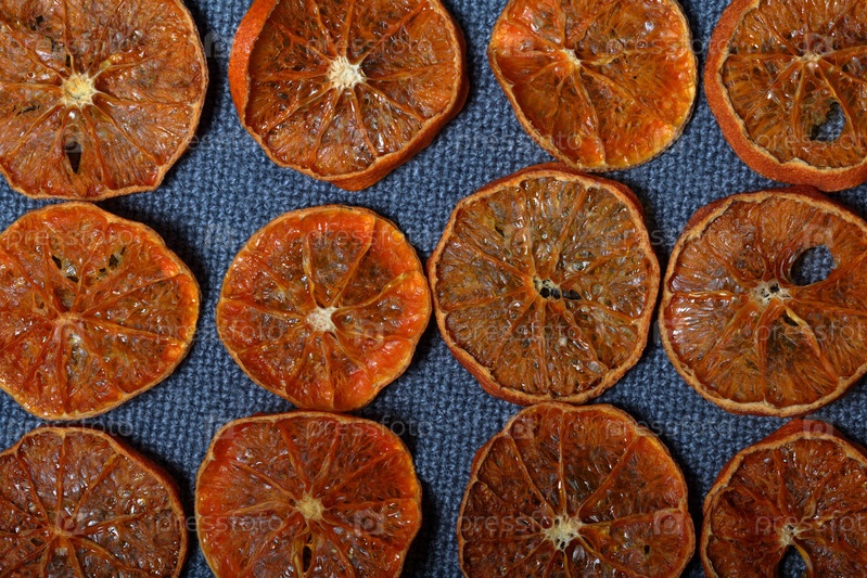 Мандарины нарезают дольками и сушат для украшения десертов. На сером фоне