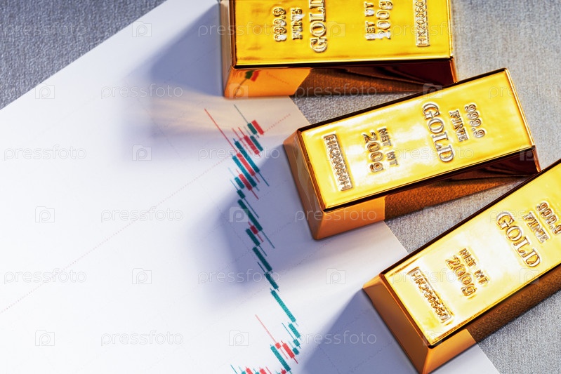 График роста цены на золото. Вид сверху на золотые слитки и график роста цен на золото