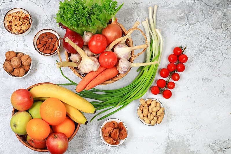 Здоровое сбалансированное питание с диетическими ингредиентами, овощами, фруктами, орехами для похудения, источником витамина С, концепцией здорового образа жизни и детоксикационной диеты, рекламой магазина и кафе,