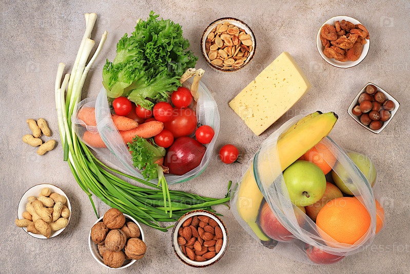 Здоровая сбалансированная диета с диетическими ингредиентами, овощами, фруктами, орехами и сыром для похудения, источником витамина С, здоровым образом жизни и концепцией детокс-диеты, рекламой магазина и кафе,