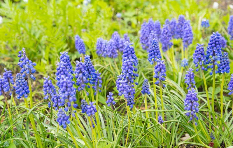 Первые весенние цветы синие мускари в саду