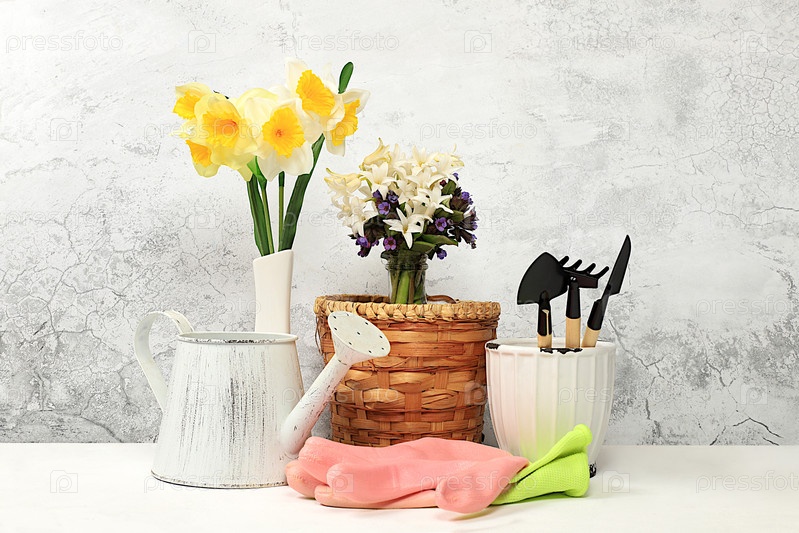 Садовые инструменты, цветы гиацинта и нарциссы, лейка на бетонном фоне. Концепция весенних садовых работ. Цветочная композиция для баннера. Макет дизайна с местом для отображения