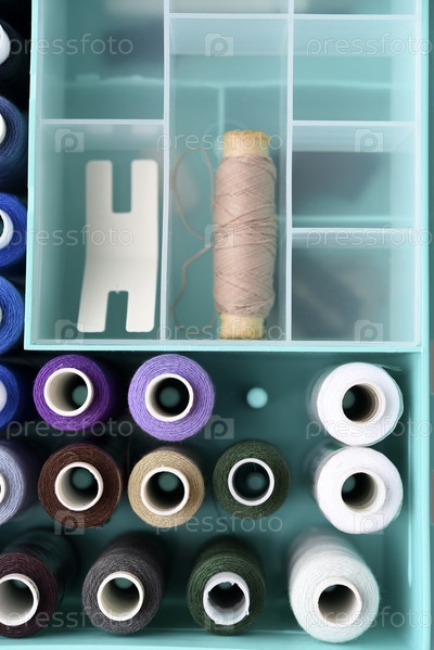 Набор разноцветных швейных ниток. Мотки ниток в пластиковой коробочке