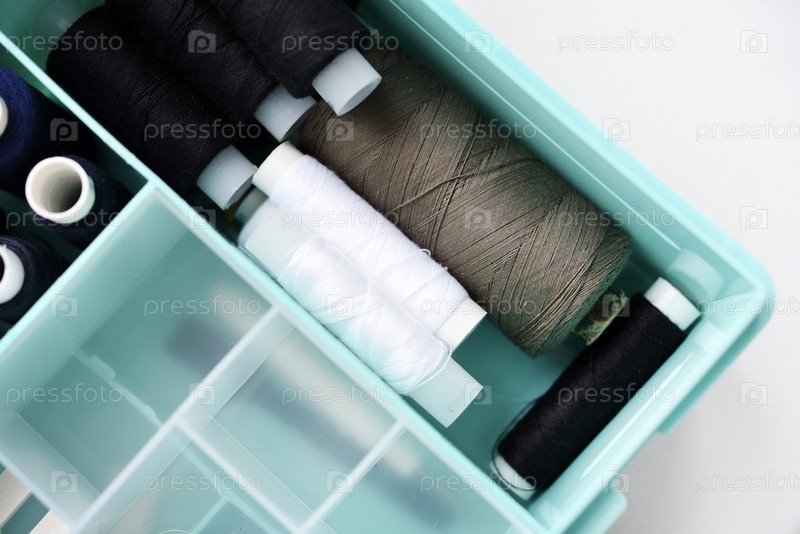 Набор разноцветных швейных ниток. Мотки ниток в пластиковой коробочке