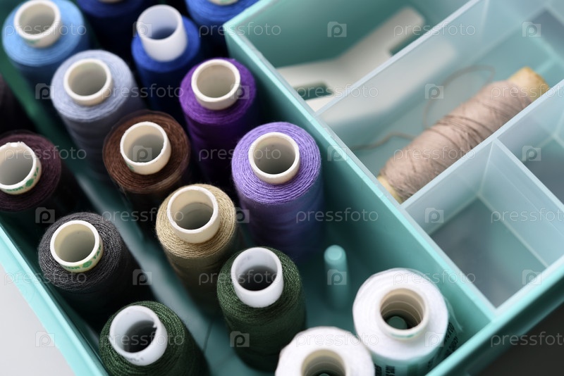 Набор разноцветных швейных ниток. Мотки ниток в пластиковой коробочке