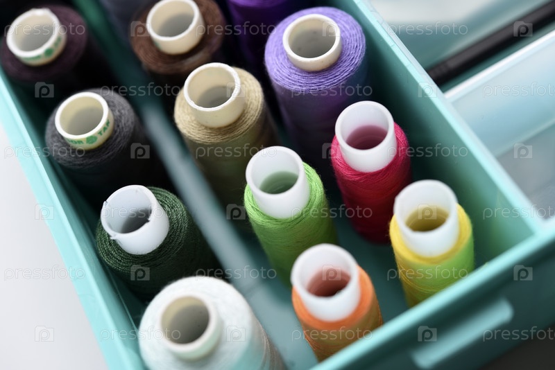 Набор разноцветных швейных ниток. Мотки ниток в пластиковой коробочке
