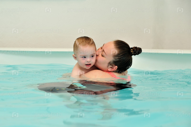 Мать и ее ребенок с синдромом Дауна плавают и играют в детском бассейне с голубой водой. Женщина крепко обнимает и целует своего ребенка-инвалида. Портрет. Горизонтальная ориентация