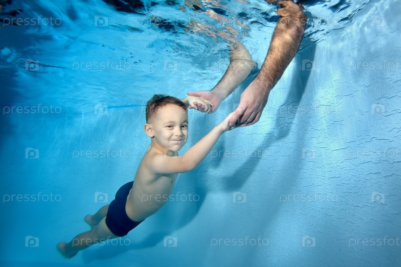 Маленький мальчик плавает под водой в бассейне. Папа опускает руки под воду и ловит ребенка. Портрет. Крупный план. Концепция. Горизонтальная ориентация