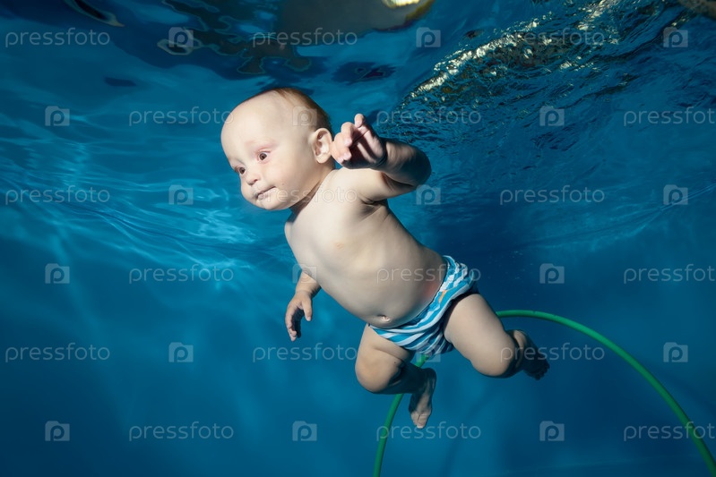Очаровательный малыш учится плавать под водой в детском бассейне. Портрет. Вид снизу. Горизонтальная ориентация изображения. Подводная фотография