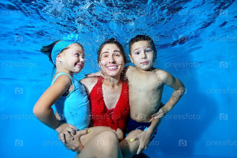 Счастливая семья: взрослая мать, ее маленький сын и маленькая дочь играют под водой в бассейне, улыбаются и позируют перед камерой на синем фоне в окружении пузырьков. Крупным планом