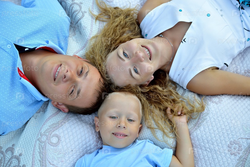 Улыбающаяся семья: мама, папа, малыш, лежат на одеяле и смотрят в камеру, солнечный летний день. Понятие семейного счастья. Портрет. Вид сверху. Горизонтальный вид