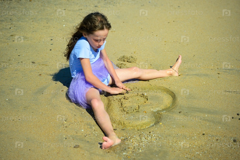 Красивая маленькая девочка сидит на пляже на побережье и рисует сердце из песка. Крупный план. Альбомная ориентация