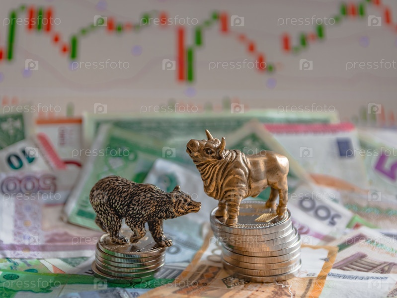 Бронзовые фигуры быка и медведя возле металлических монет на фоне бумажных денег и диаграмм. Размытие фона и перспективы. Концепция и символ фондовой биржи и торговли акциями