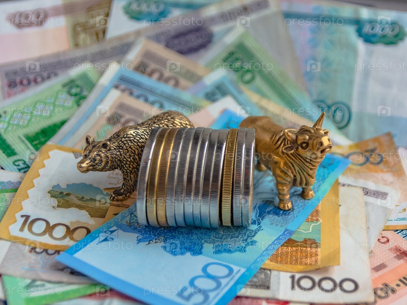 Бронзовые фигурки быка и медведя возле металлических монет на фоне бумажных денег. Размытие фона и перспективы. Концепция и символ фондовой биржи и торговли акциями