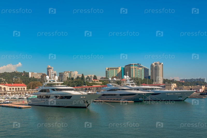 Морской порт летом. На пристани стоит множество разных яхт и катеров. Яхтсмены и путешественники готовятся к выходу в море. На фоне здания приморского города