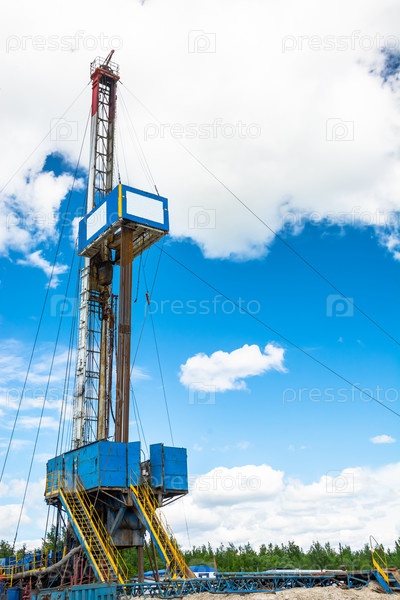 Мобильная буровая установка для бурения нефтяных и газовых скважин. На фоне голубого неба. Арматура для добычи нефти и газа расположена рядом с буровой